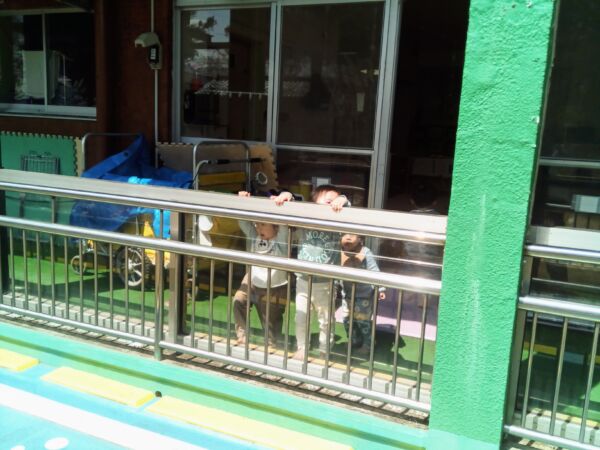 食事を終えたうさぎ組さんがテラスから様子を見てます。