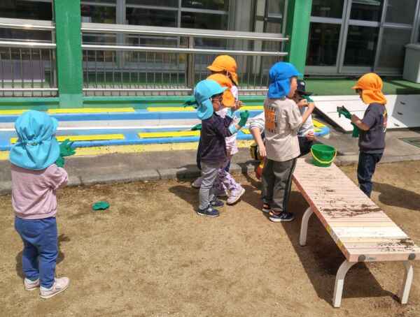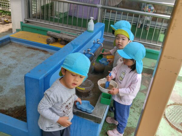 水の感触が気持ち良い気候になり、プチ泥んこ遊びを楽しんでいるグループです。