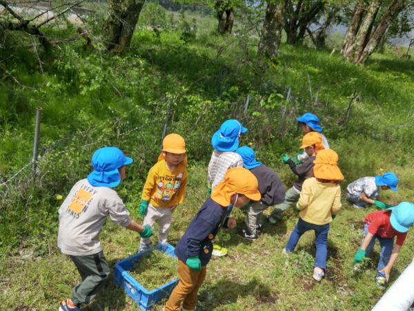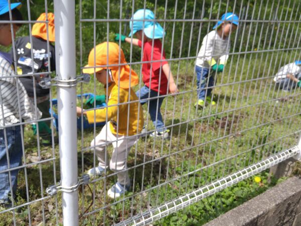 園庭の柵の向こうでは、軍手をした子どもたちが、畑の草取りをしていました。