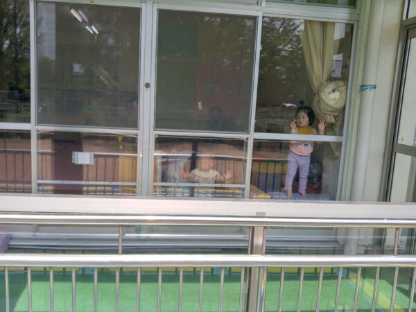 賑やかな園庭の様子をひよこ組、うさぎ組のお友だちも眺めています。
