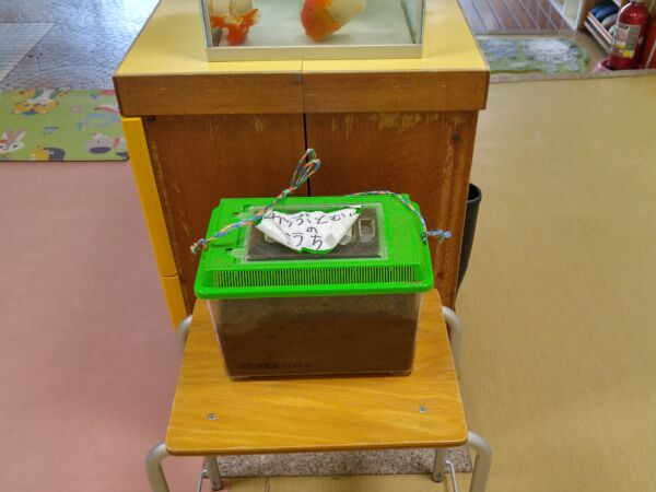 残念ながら一足遅く、作業は終わっていたのですが、ケースに入った幼虫は玄関に登場!