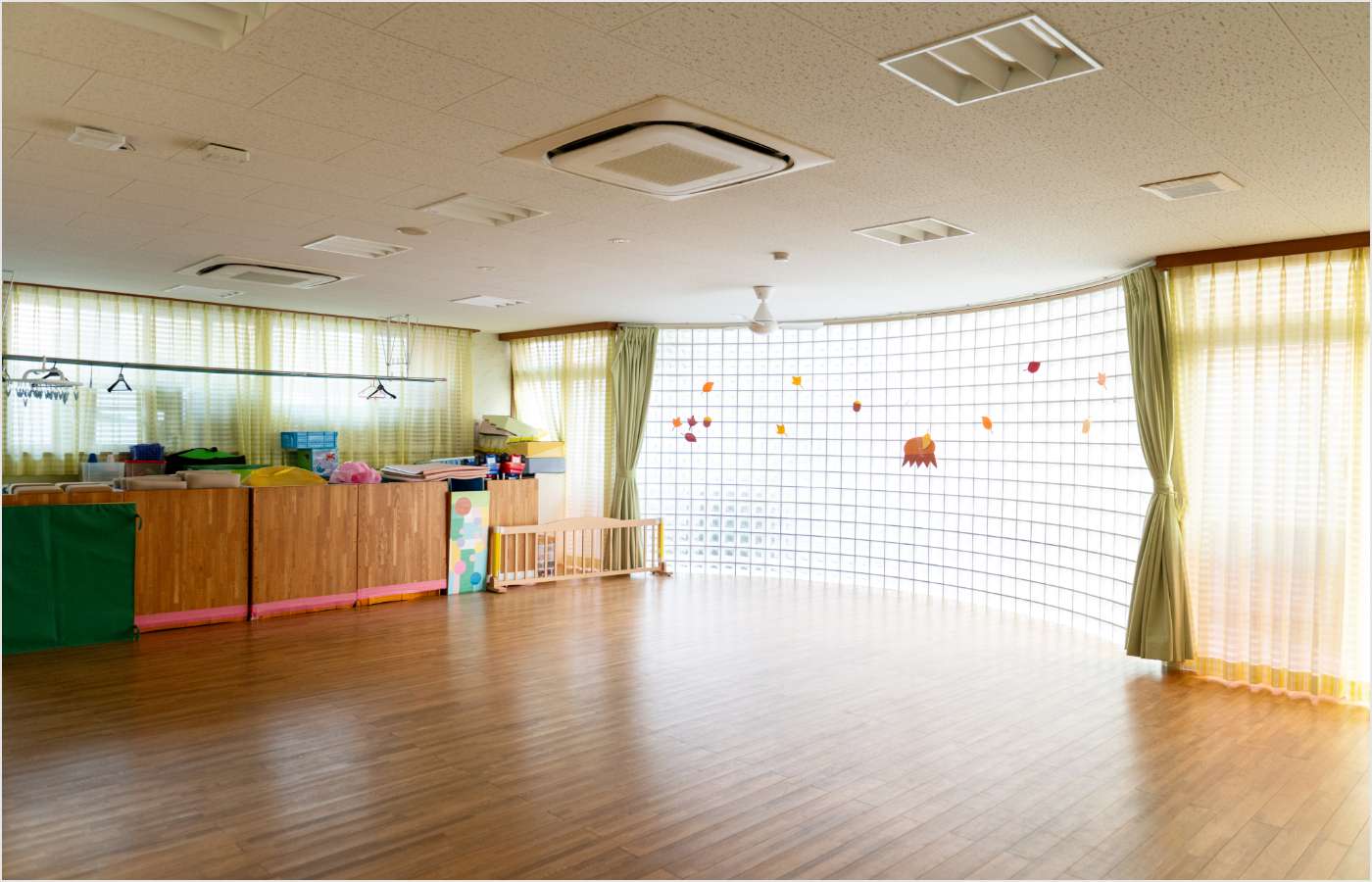 1F小ホール0、1、2歳児のお友達が中心に使用します。伸び伸び体を動かし、運動遊び等を楽しんでいます。