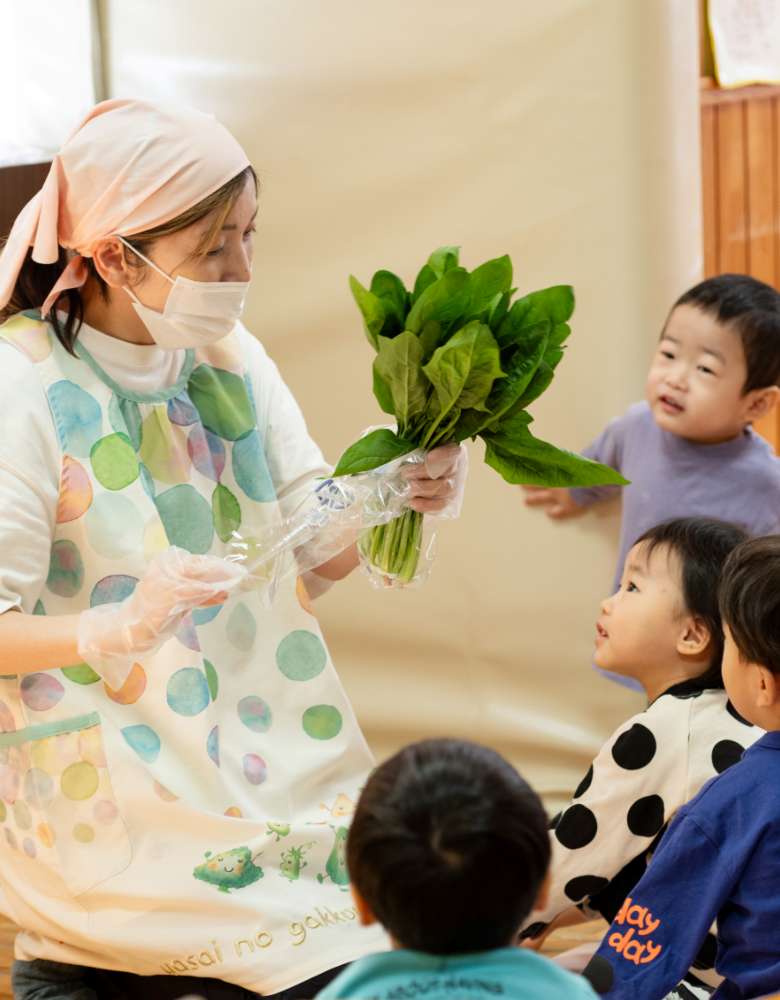 また、野菜づくりやクッキング活動、食材のお買い物などを保育の中に取り入れ、食への関心や感謝の気持ちを育む食育にも力を入れています。子どもたちが「楽しく・美味しく」食と関わる時間を大切にしています。
