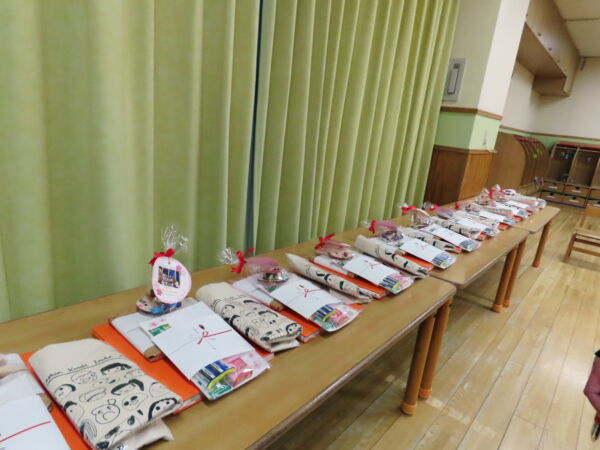 子ども達の思い出のアルバムと一緒に卒園記念品、卒園遠足で作成したキーホルダーも持ち帰ります。子どもたちのイラストが描いているものは、謝恩会の方からの記念品です。