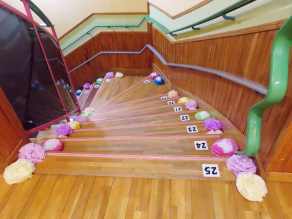 子ども達が色を塗って仕上げた段ボール博物館の恐竜たちも色鮮やかで、華やかさがより一層増しています。階段も華やかに♪