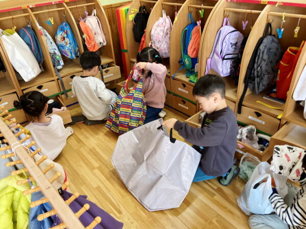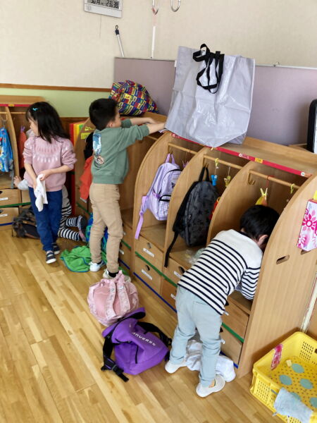まずは着替えを持ち帰る準備!おうちから持ってきた袋に荷物を入れて、ロッカーの中をきれいに拭きました。