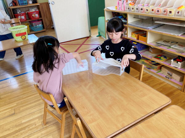 お絵描きをした紙も大切に保管してきたお道具入れ。「ありがとう」の気持ちを込めてきれいにし、「次のお友だちに使ってもらってね」そんな優しい気持ちがあふれていました。