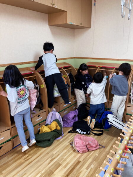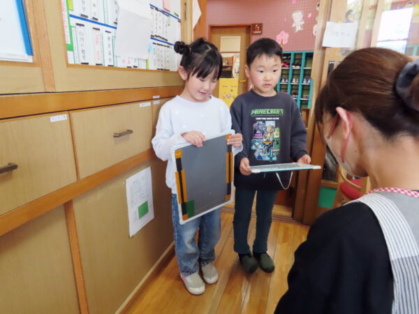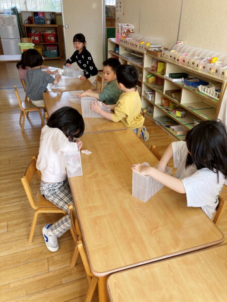 毎日お当番さんが、給食室へ三食板を取りに行き、その後献立を事務所へ発表しに来てくれています。春はまだひらがなが読めず、一緒に読んでいた子たちも、遊びの中で文字に興味を持ち、今では自信をもって発表する姿にとても成長を感じます。