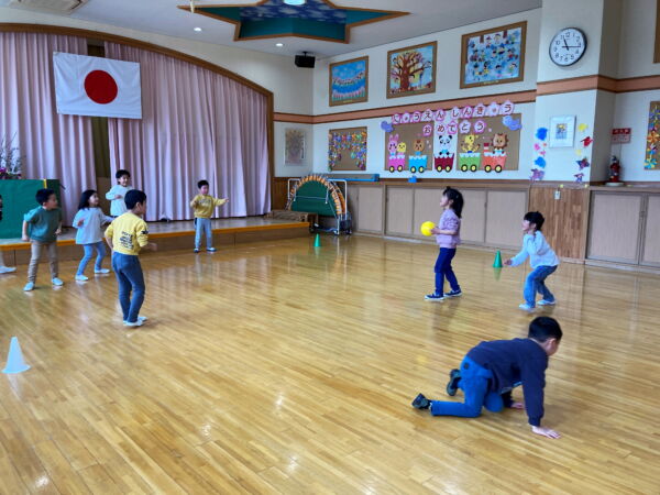 ドッチボールは線がなくても、コーンを目印に楽しめるようになりました!!ボールの速度も上がり、逃げる時の逃げ方もとっても上手になりました!