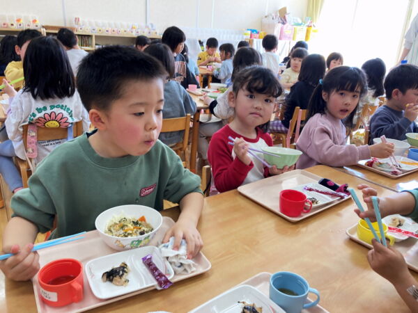 離乳食を食べていた事、手づかみ食べからスプーンを使い、お箸も使えるようになった事、好きなものと苦手なものがはっきりしてきた事、たくさんの食材に触れてきた事、自分で食べられる量を考えられるようになった事、苦手な食材も少し食べてみようと挑戦した事…。給食を食べる中でもたくさんの成長が見られました。