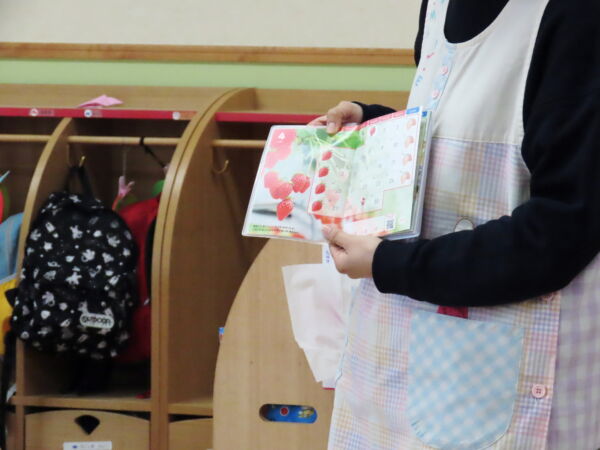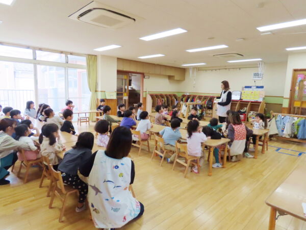 毎日のシールお帳面の使い方を確認しました。「シールの片付け方は?」「シールを貼ったらお帳面はどうするの?」先生が子どもたちに問いかけ、きりん・らいおん組さんが教えてくれました。ぱんだ組さんは初めてのことにドキドキ。お兄さんやお姉さんの話をよく聞いていました。