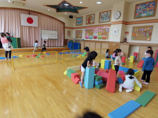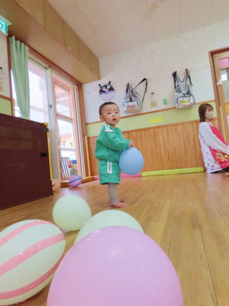 クラス移動のないうさぎ組さんは、これまで通りゆったりと、小ホールやお部屋で運動遊びや風船遊び、知育玩具を楽しみました。