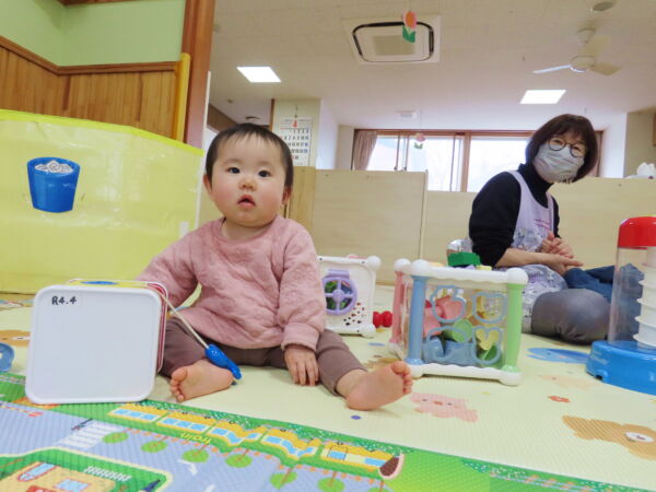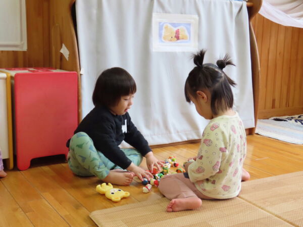 りす組のお部屋のおもちゃに興味津々♪指人形でお友だちとごっこ遊びのようにやり取りをしようとしたり、ミニカーで遊びを共有したり、アイクリップで指先を使った遊びをしたりと、じっくり遊ぶ姿が見られました。