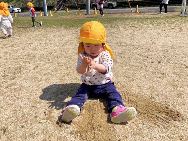 お砂発見!座っておててにつけて、砂の感触を手のひらいっぱい感じていました。