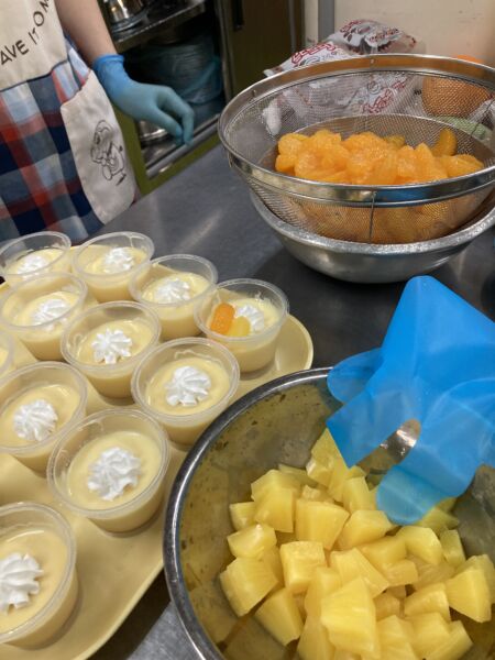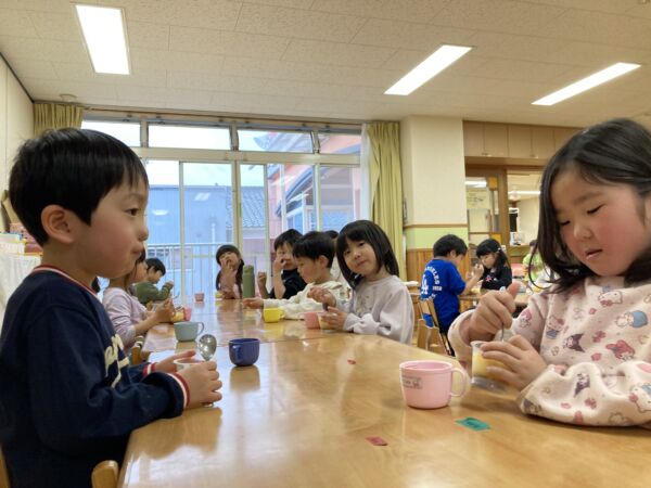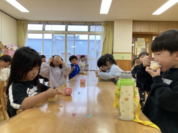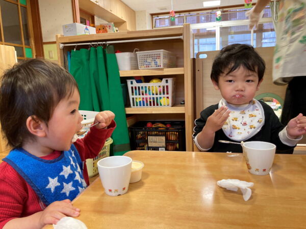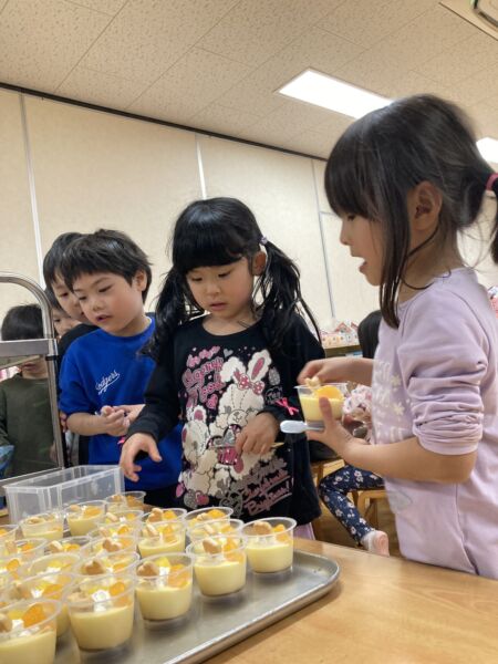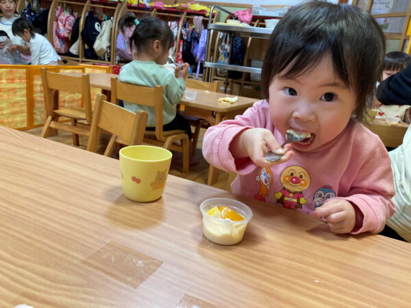 今日のおやつは「入園・進級お祝いおやつ」です☆ 園日記 2026.04.10 今日のおやつはプリンにフルーツと生クリームを飾り付けたお祝いおやつでした。 給食の先生がお昼寝時間中に作ってくれていました♪ 子どもたちの喜ぶ笑顔を想像しながら、一つ一つ盛り付けてくれました。 おやつの時間、子ども達はおやつを見て大喜び♪「かわいい!」「おいしそう!」「きれい♪」と、おやつにくぎづけでした☆ 大きくお口をあけて…「あーん!」 おいしかったね!!
