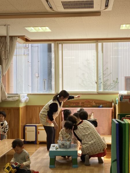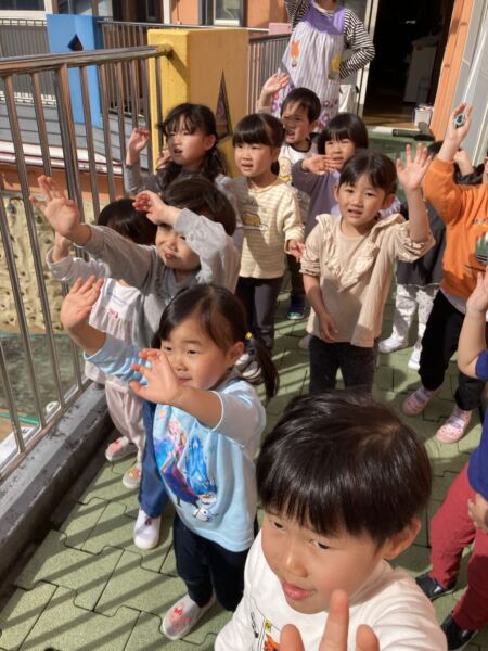 また、ぱんだ・きりん組さんは2階のテラスから見学しました。