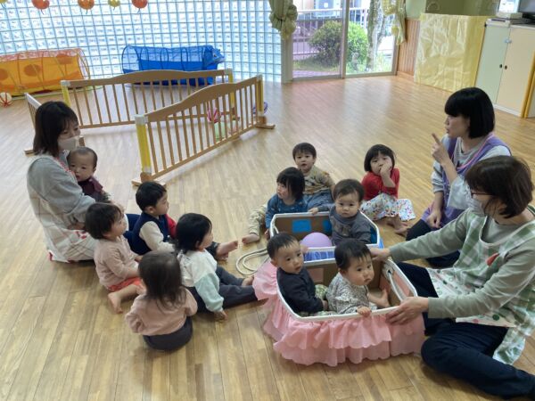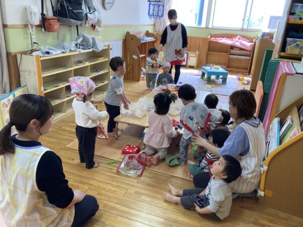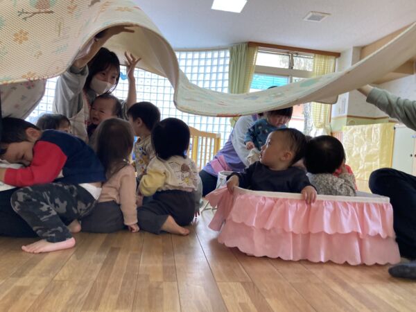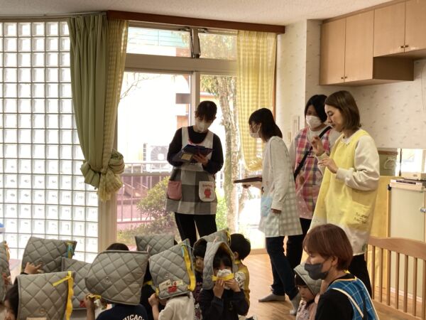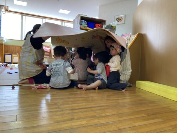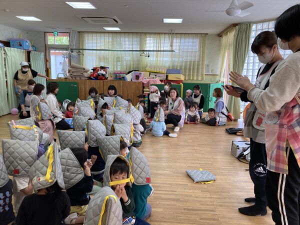 地震の音の放送が流れました。怖くて、先生にギュッと抱き着く子、涙する子も様々ですが、うさぎ組やりす組のこたちは一か所に集まり、先生がマット等を覆いかぶせ、頭を守ります。
