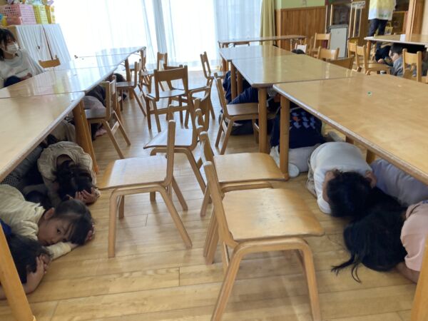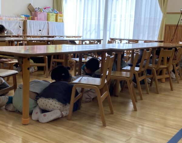 ぱんだ・きりん・らいおん組は地震の音を聞いて、机の下で身を守りました。