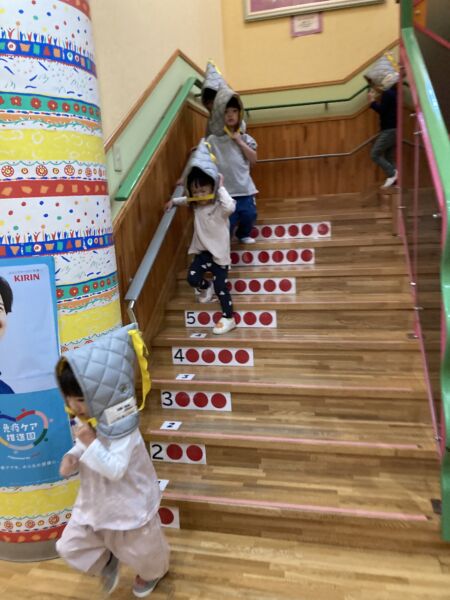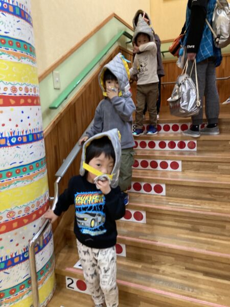 今度は、火事を想定した訓練を実際に行います。今日はファミリーマートから出火の想定で避難をしました。ぱんだ・きりん・らいおん組は防災頭巾をかぶり、室内階段を使って、小ホールへ避難しました。