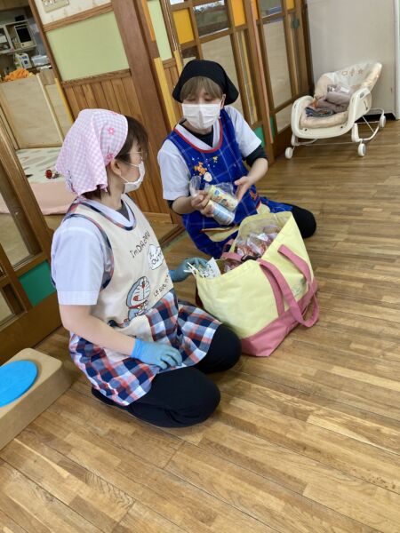 給食の先生は避難した際の緊急用おやつを持ち出します。定期的に消費期限の確認を行い、非常時にも食べられるようにしています。
