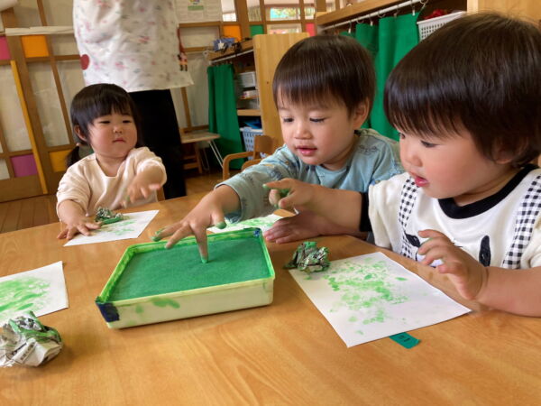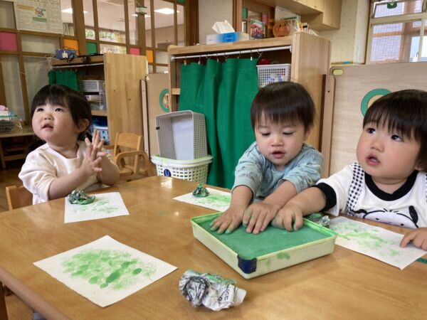 何ができるかな?(うさぎ組) 園日記 2026.04.15 緑のスタンプでペタペタ…♪チョンチョンと触ってみたり、手のひらでギュッとスタンプしたり、新聞紙でスタンプをしたり、楽しそうでもあり感触をとっても楽しんでいます。 感触遊びや素材あそびを楽しみながら、春の制作を楽しんでいます。どんな作品ができるかな?楽しみです♪