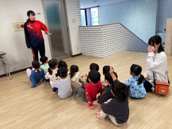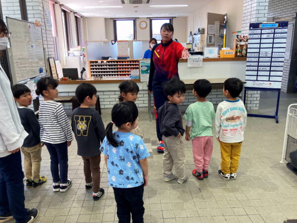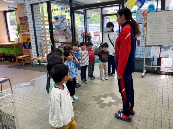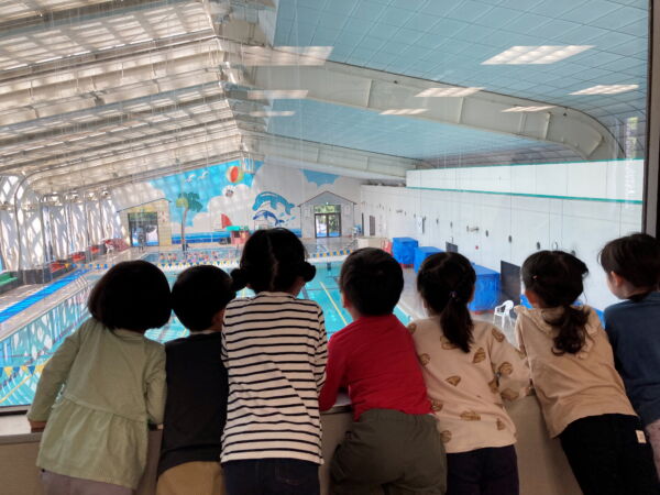 きりん組になるとスイミングが始まります!初回の今日は、オリエンテーションを兼ねて見学へ行きました。