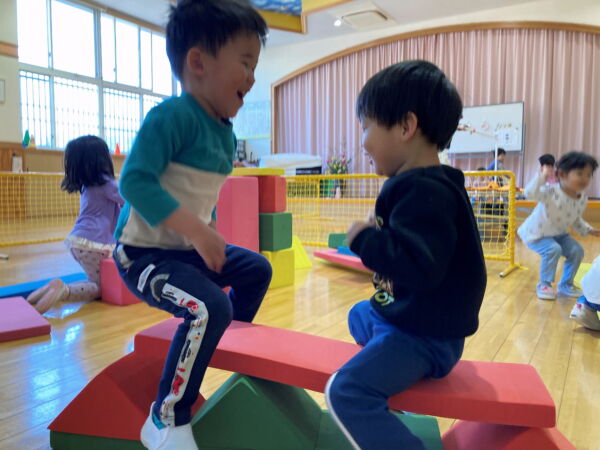 何度も跳ねていると、大型積み木がしなってきました。シーソーの乗るブロックがずれてきている事よりも、楽しさが勝り大笑いしながら楽しんでいましたよ。