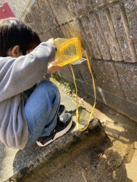 少し離れた場所では、生き物を探したり、そっと観察したりしている子たちもいました。
